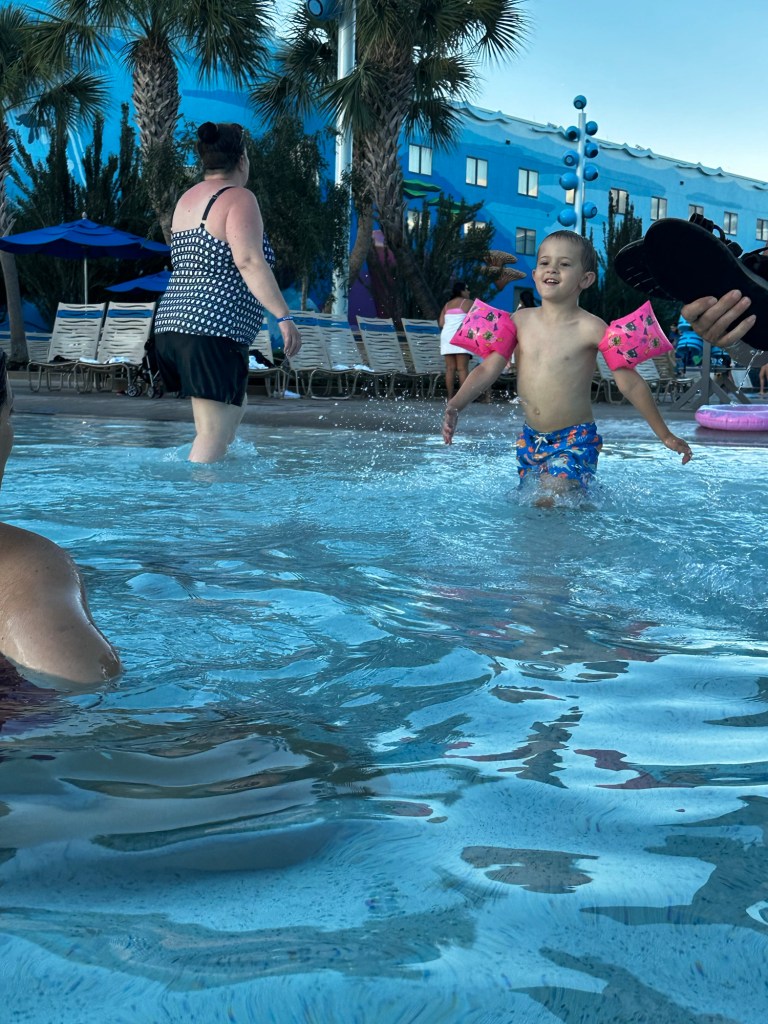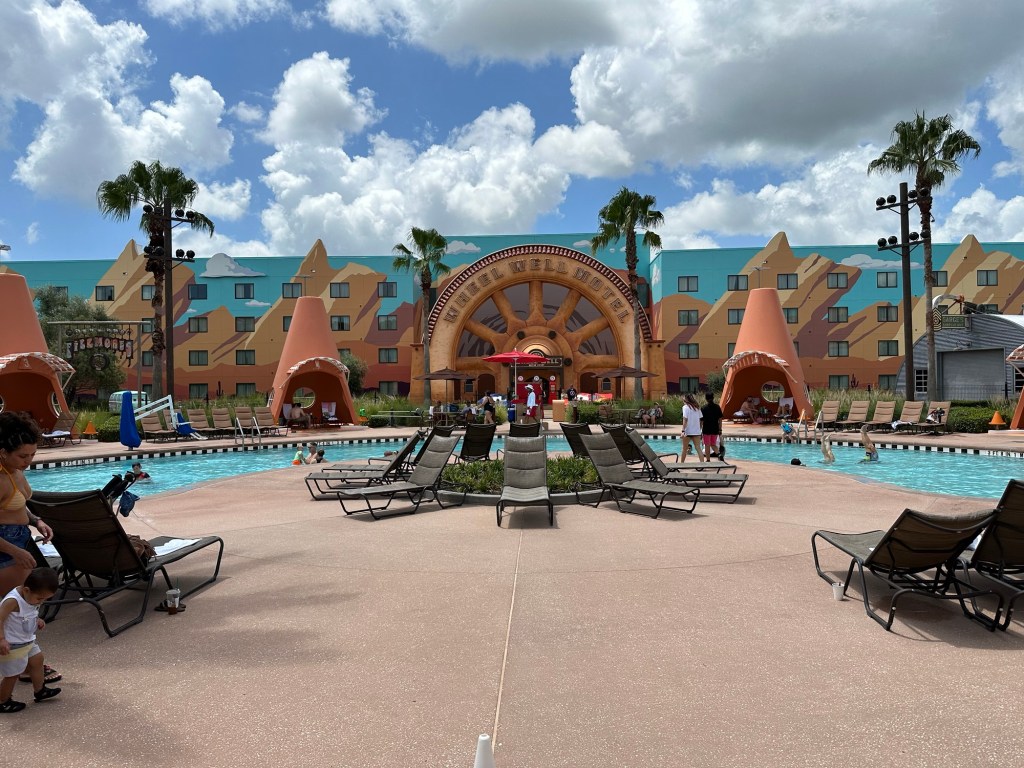 2. The pools. There are 3 pools- a Little Mermaid themed, a Cars themed, and a Nemo themed. The Nemo pool is in the center of the resort, is VERY big, and has splash pads and water playgrounds. In fact, this pool is the largest pool of all Disney World Resorts. It even has a beach-like entrance so little ones can play in a shallow area. There are plenty of lounge chairs and tables to sit at in all 3 areas. The tables have umbrellas for shade. There are also pool towels provided, and they are easily accessible. The Nemo pool has a station outside to fill up the refillable resort mugs with cold pop while you’re still in bathing suits. All 3 have numerous life guards on duty at all times and are open 10 am to 11 pm.