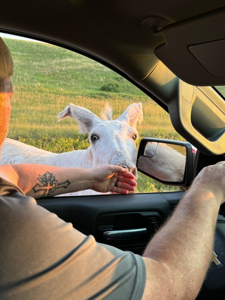 The Wildlife Loop was amazing. It was 18 miles long with beautiful wide-open scenery. We saw 12 white-tailed deer, an uncountable amount of mule deer, several buffalo, and many burros. The burros come right up to the cars for food and attention. Some of the burros were just babies. I just loved these donkeys!