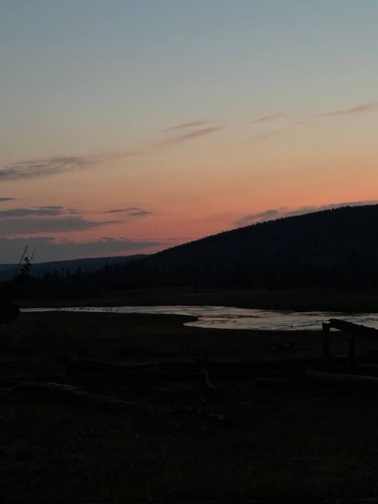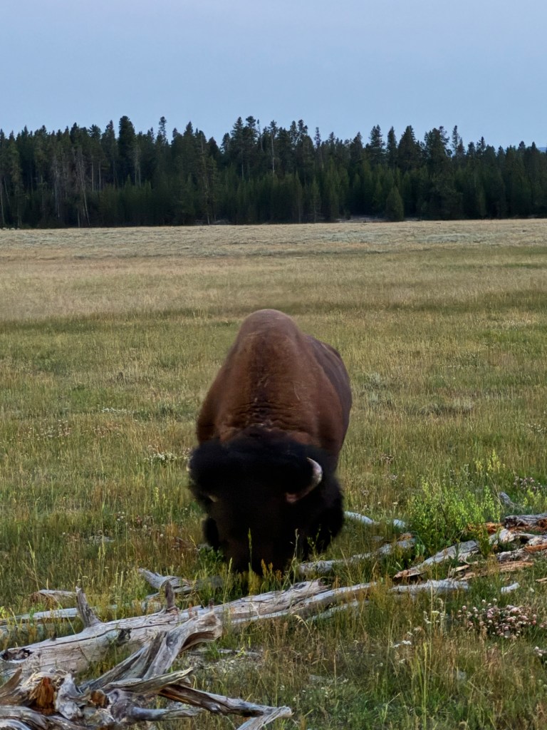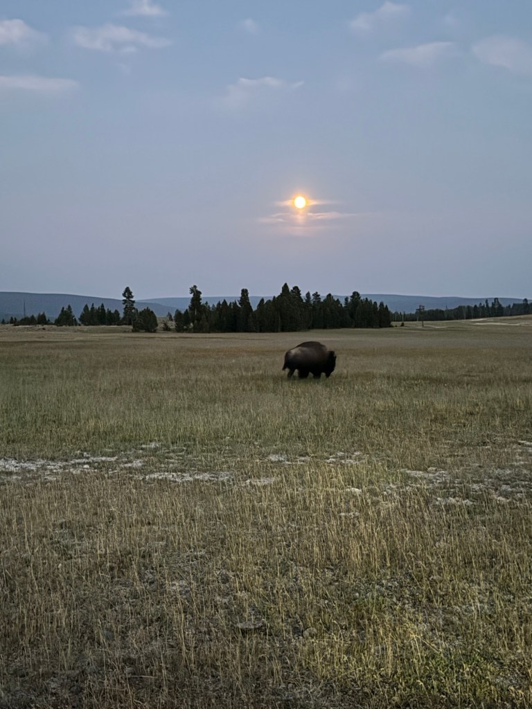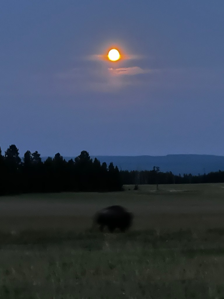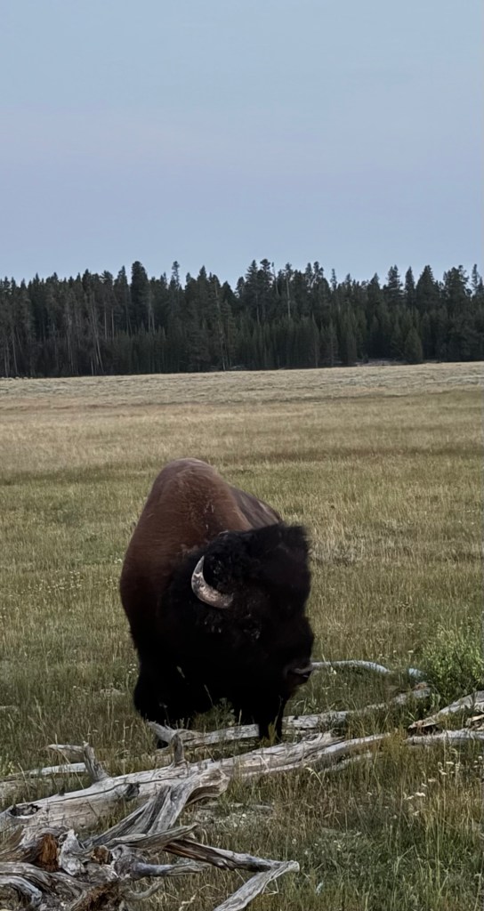On day 12 of our roadtrip, we decided to try some sunset watching and star gazing in Yellowstone Park, and it did not disappoint! It was a cloudy night, so the star gazing was a bust, but the sunset and scenery were incredible. Jim spotted a buffalo and pulled over without telling me. I was looking at the road ahead, and when I turned and looked out my window, I screamed because the buffalo was right next to my window!