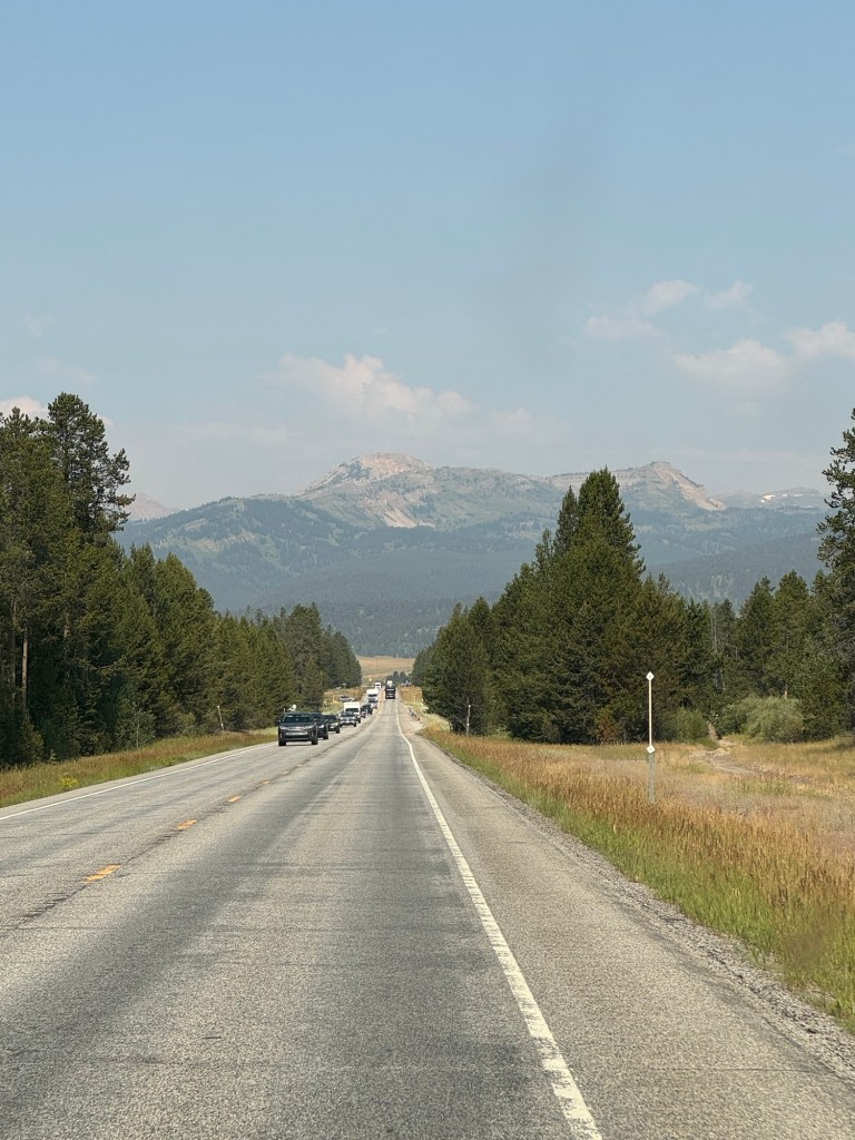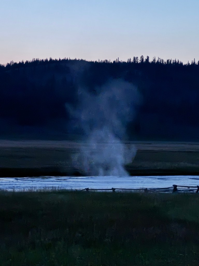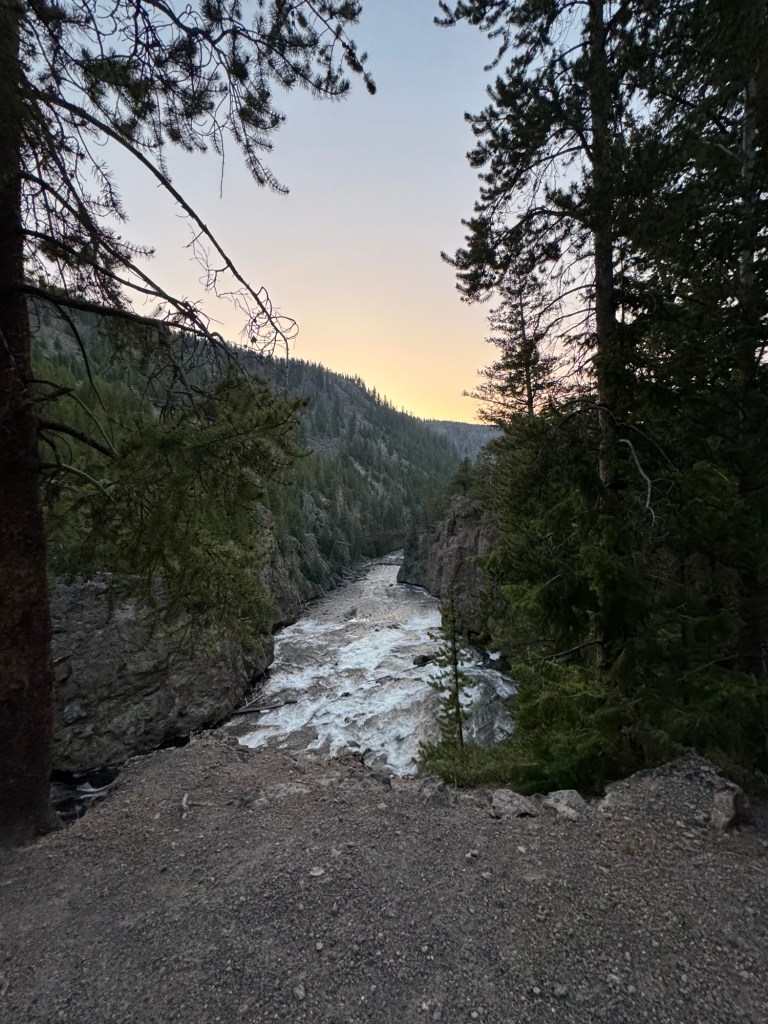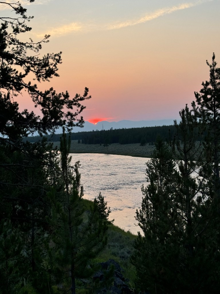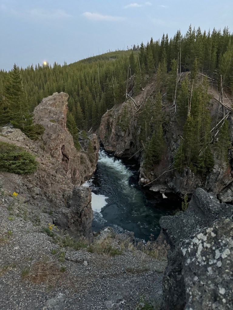On day 12 of our roadtrip, we decided to try some sunset watching and star gazing in Yellowstone Park, and it did not disappoint! It was a cloudy night, so the star gazing was a bust, but the sunset and scenery were incredible. Jim spotted a buffalo and pulled over without telling me. I was looking at the road ahead, and when I turned and looked out my window, I screamed because the buffalo was right next to my window!