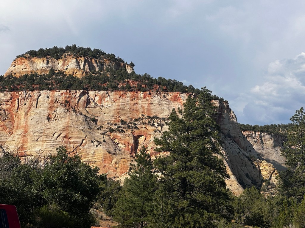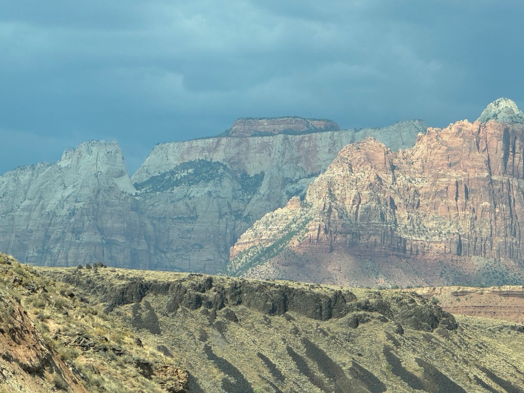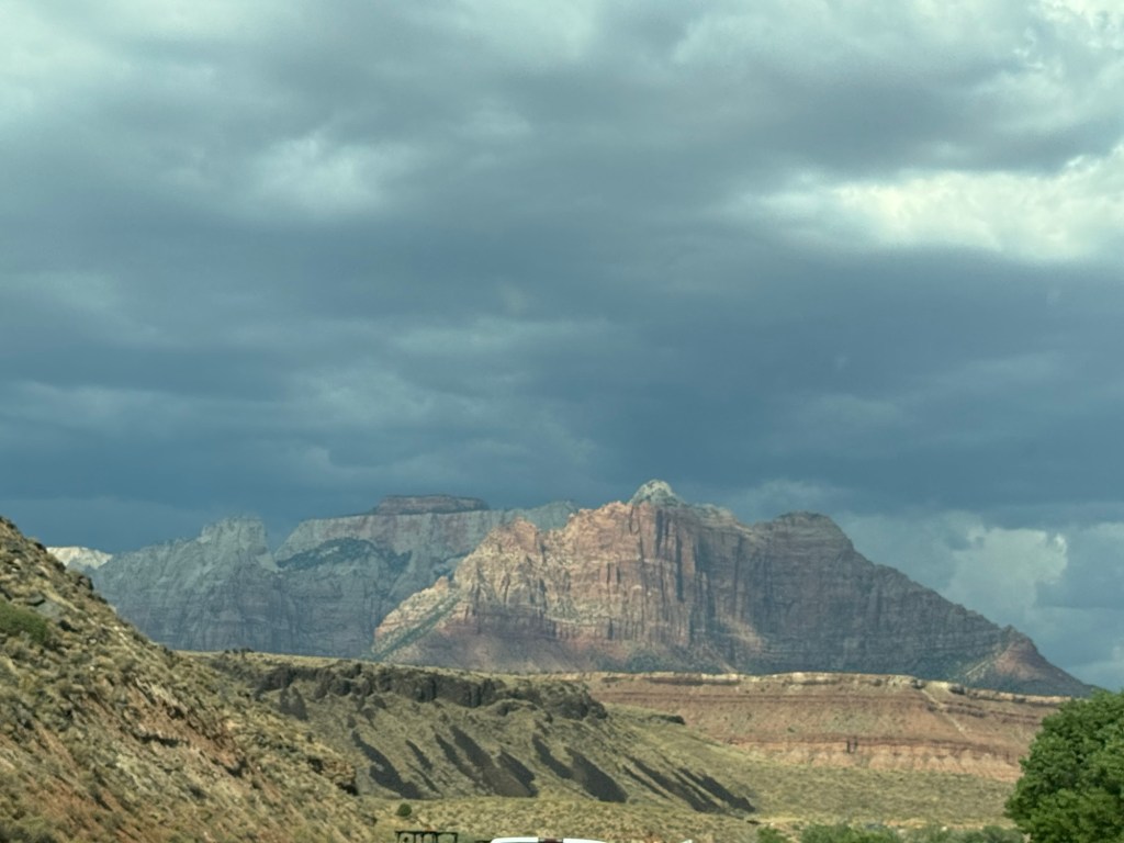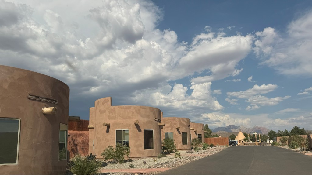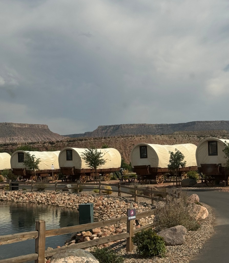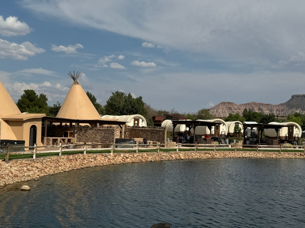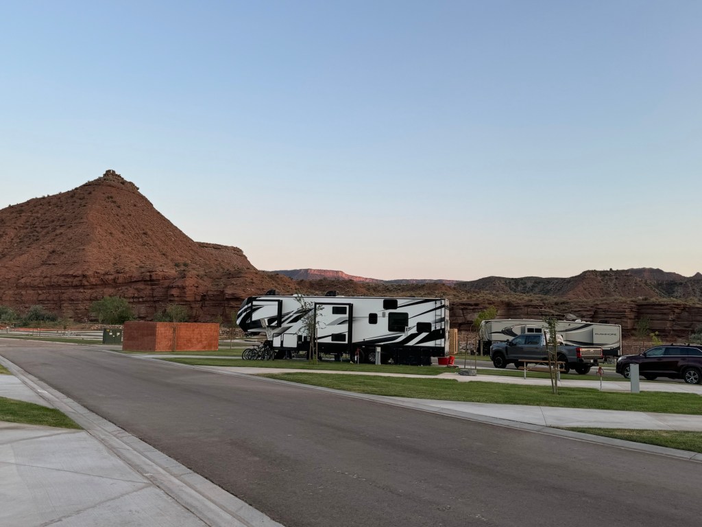 The RV Park we are in is great. It’s called the Zion White Bison Resort. It’s just 15 minutes from the park. We paid $109 for 2 nights. The park is still being built, but there are very interesting types of places to stay like covered wagons and cliff dwellings. These are luxury lodgings with A/C, hot tubs, and kitchens. They also have a dog park, tennis courts, basketball courts, beautiful views, and even bison to look at. The RV sites have grass (most of the western RV parks are just rock and the dogs hate it!🤦♀️), very level concrete, and a propane fire pit.