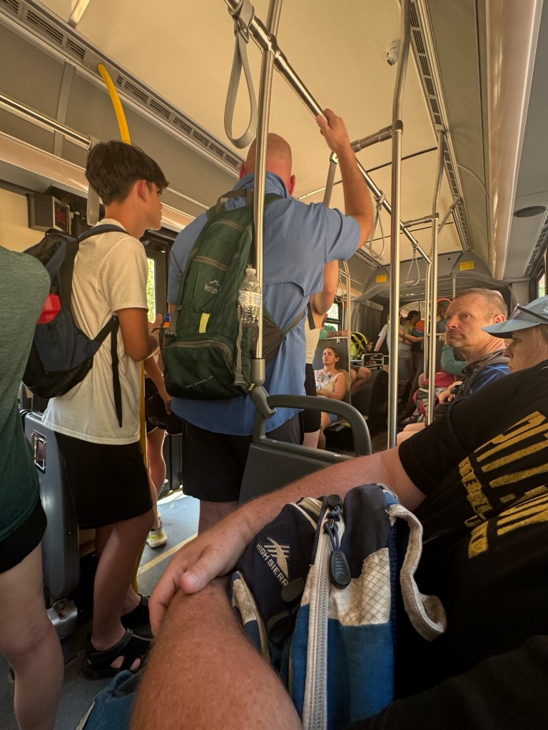 On day 19, I was SO excited to go into Zion and take the scenic drive shuttle. Well, this was the first day of our trip that was a bust…That picture above is not a New York subway- it’s the “scenic drive” shuttle. You can’t see any scenery on the tour because they cram people in like sardines. I had 2 people sweating directly on me — YUCK!! The first shuttle we took had no air conditioning, only windows that 1/2 opened and blew hair dryer hot air at you.