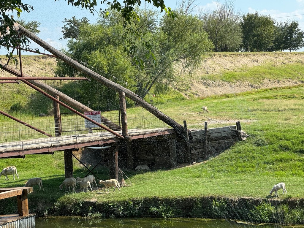 When we got just 7 minutes from our RV park, the road was completely closed. We tried to reroute around with no luck. Rerouting with a travel trailer is not the easiest thing. 🤦♀️ We finally had to call the campground, and they did apologize that they “forgot to tell us” about the road closure. We had to get back on the highway, and that 7 minutes turned into 45 minutes. The park is called Flat Farm RV Park. We paid $139 for 2 nights after our Good Sam discount. It’s on a working farm and is actually very peaceful. Our site is along a small creek and is beautiful.