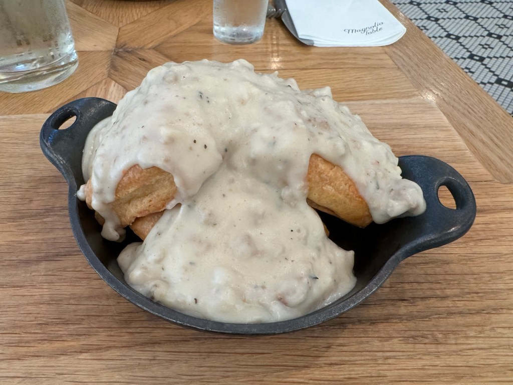 The food was delicious and reasonably priced for such a famous place. I got Joanna’s special recipe for biscuits and gravy ($11.99). Jim got a breakfast taco ($4) and breakfast potatoes ($4.50).