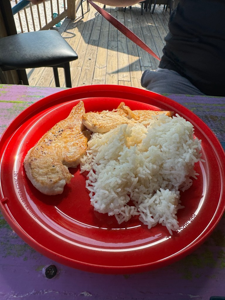 She ordered “the Bird Dog” which was chicken and rice. They brought her some water in a tin first, and then her food came quickly and hot! I actually had to cut it up for her. They served it in a frisbee that Zelda could keep.