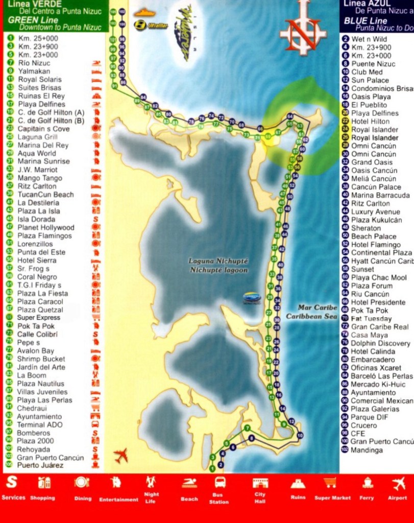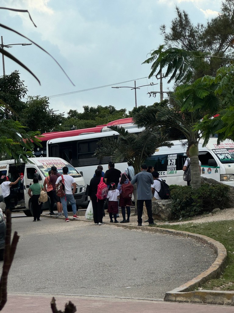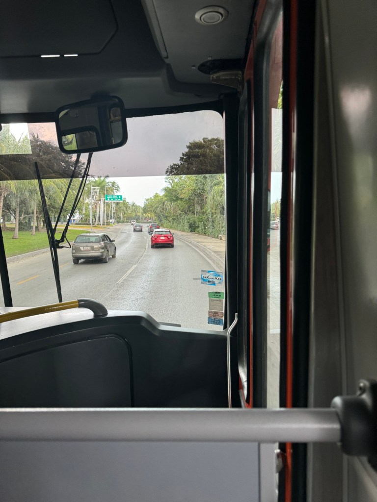 Cancun has an amazing bus system. The busses are nice, and it’s only $1 US to get on the bus and go as far as you want. There are bus stops all over, and the busses run every few minutes. On one side of the street the busses go north. On the other side they go south. The bus drivers often don’t announce stops, so tell the bus driver your stop when you get on the bus.