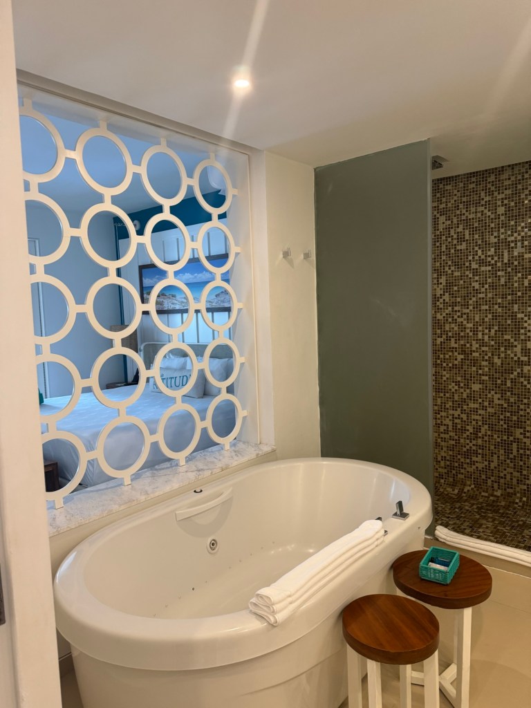 Our suite had a VERY large jacuzzi tub and a separate rainfall shower. It also provided 2 TVs with plenty of English language programming, a king bed, a couch, a table, reading lights, lots of places to charge phones, very efficient air conditioning, plenty of storage, a digital safe, an espresso machine, a mini fridge, his and her sinks, two robes and an umbrella. The cleaning staff was very efficient and did a great job keeping our room clean and stocked with bottled water, coffee, bubble bath, bath salts, etc. You can also conveniently request any housekeeping services or items right on their app.