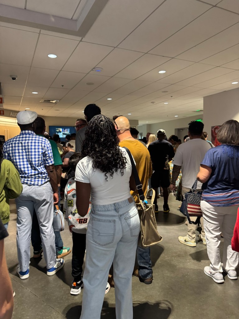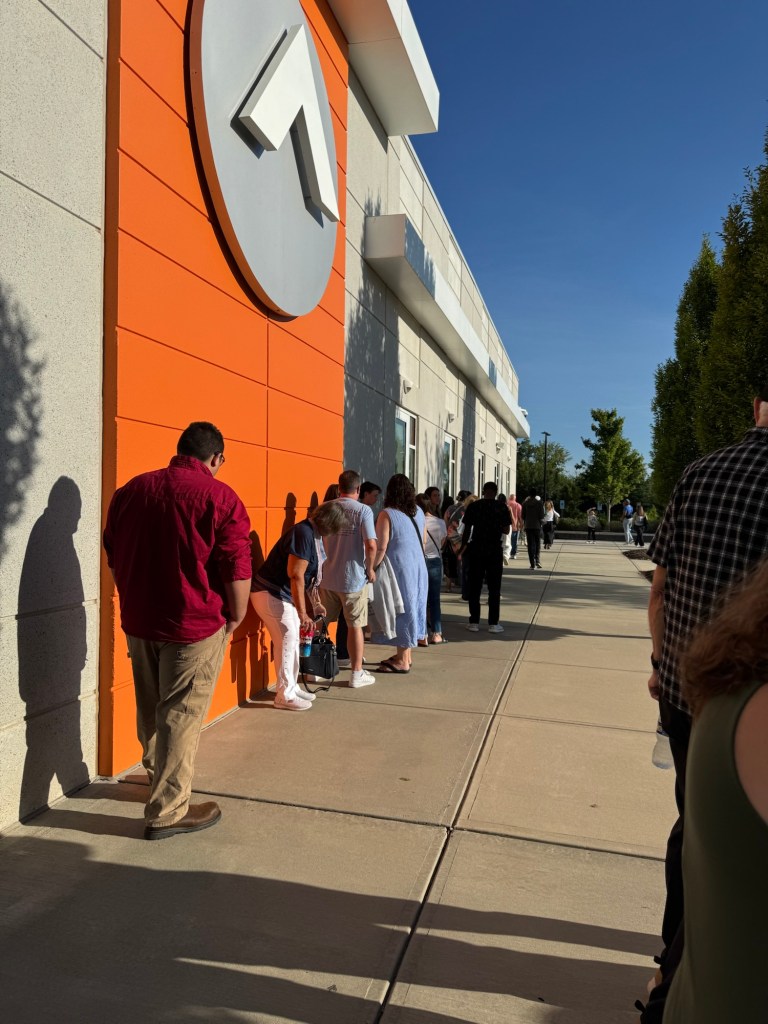 If it’s your first time, you can just put your hazards on, and you get VIP parking. We were able to park and walk to the line by 8:17 am. They started letting us in the building at 8:19. (They let me bring my coffee in with me😁). We were able to wait in the air-conditioned lobby at 8:20.