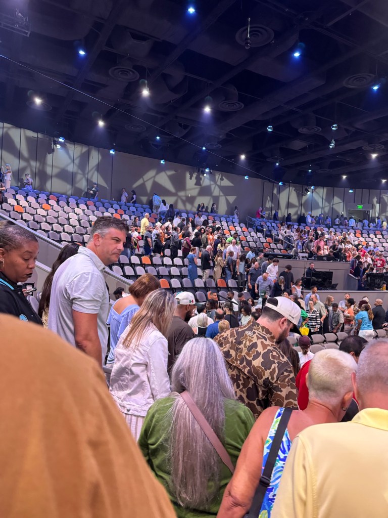 We were in our seats by 8:58. They tell you exactly where to sit. There’s no saving seats for people who aren’t in the building, so don’t send one person ahead to wait in line and save seats.